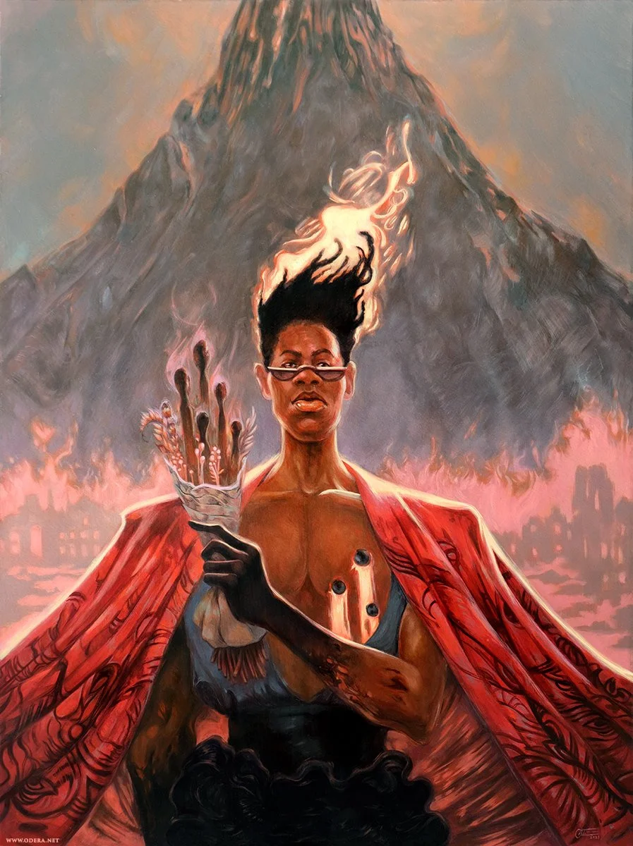 The Volcano is an avatar of Black Rage that is anchored in love and protection. They alchemize centuries of debilitating anger into a call to action that seeks transformative justice. They are the ancestral flame that scorches violent systems to make room for new life. They hold a bouquet of flame that can light the fires of change, or to release the heaviness that comes with a slow and patient eruption.
